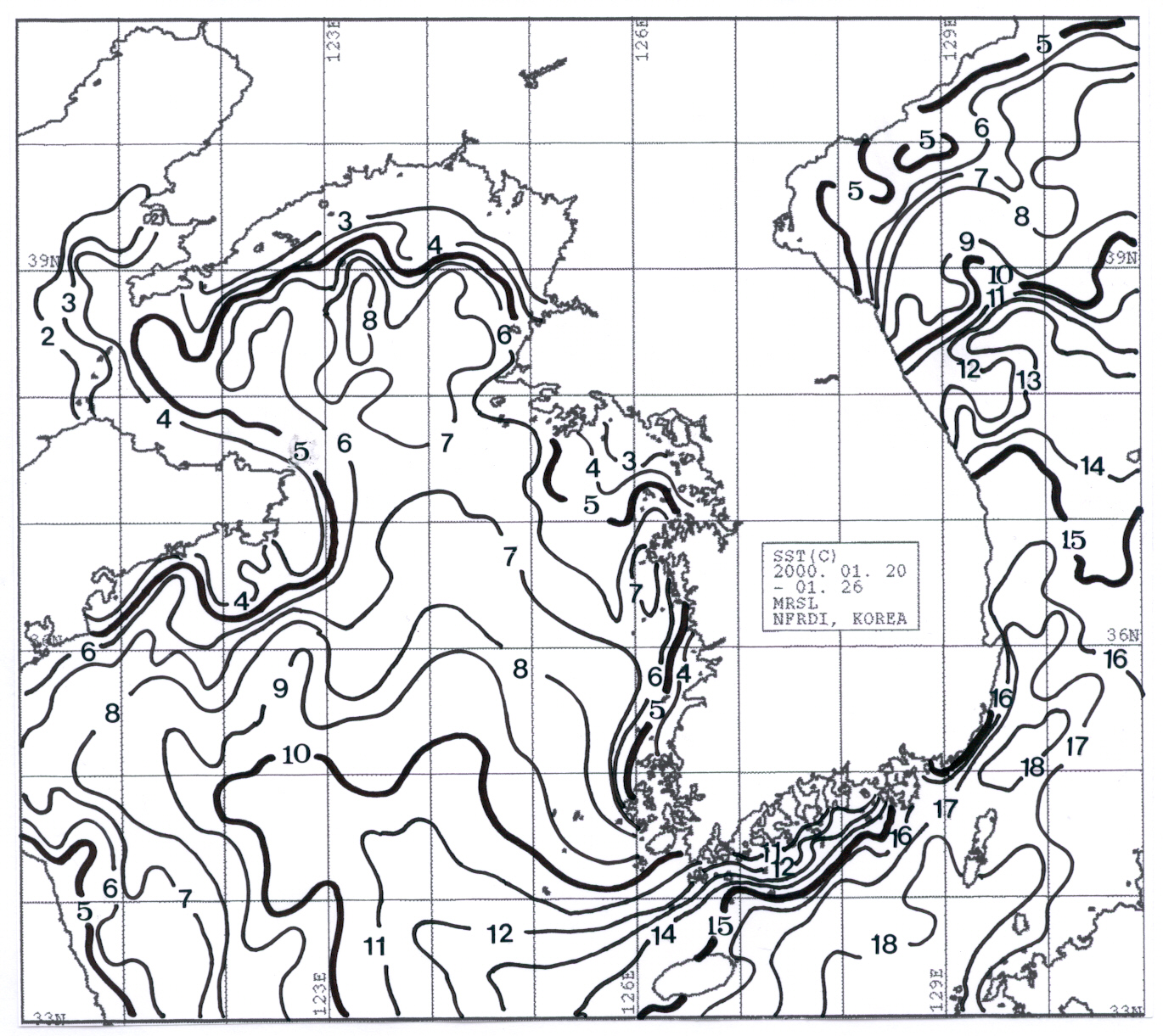 o 2000년 1월 20일부터 26일까지 합성한 한국근해 수온분포도입니다.