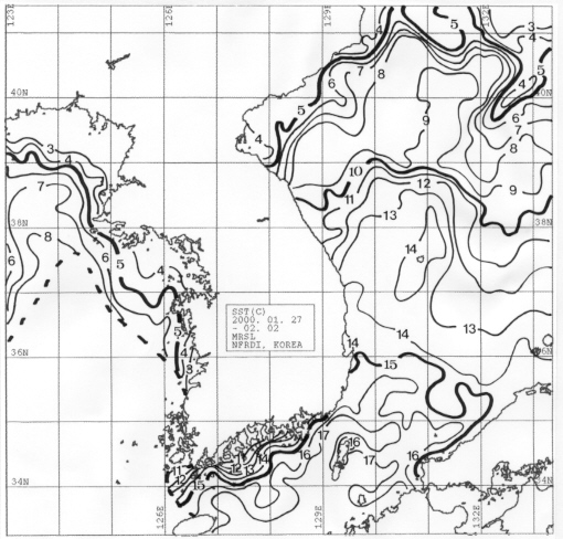 ㅇ 2000년 1월 27일부터 2월 2일까지 합성한 한국근해 수온분포도입니다.