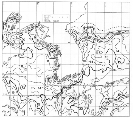 ㅇ2000년 5월 11일부터 5월 16일까지 합성한 한국근해 표면수온분포도입니다.