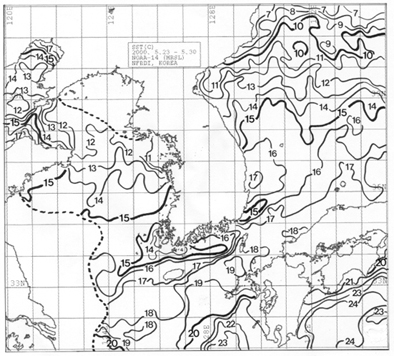 ㅇ2000년 5월 23일부터 5월 30일까지 합성한 한국근해 표면수온분포도입니다.