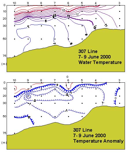 307선(태안반도 서방)의 수직수온분포도 및 평년편차도 입니다.