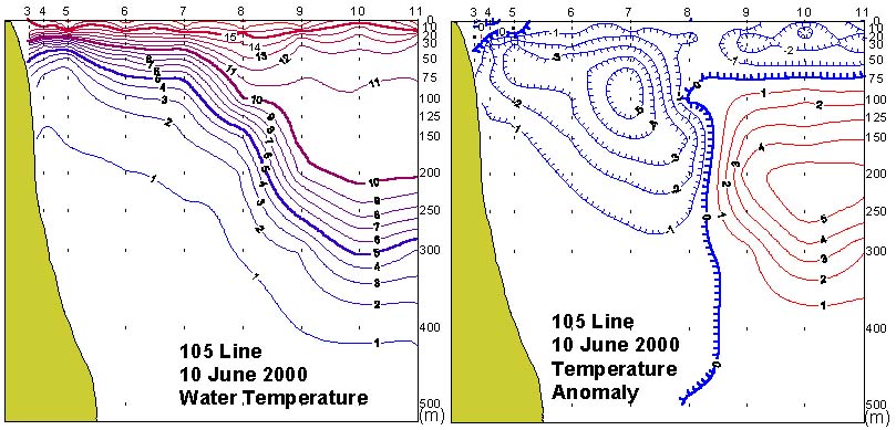 105선(동해 동방)의 수직수온분포도 및 평년편차도 입니다.
