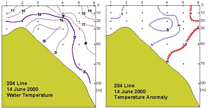204선(소리도-우도)의 수직수온분포도 및 평년편차도 입니다.