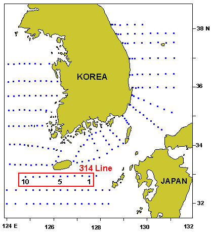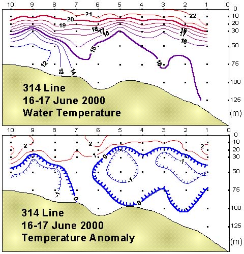314선(제주 남부해역)의 수직수온분포도 및 평년편차도 입니다.