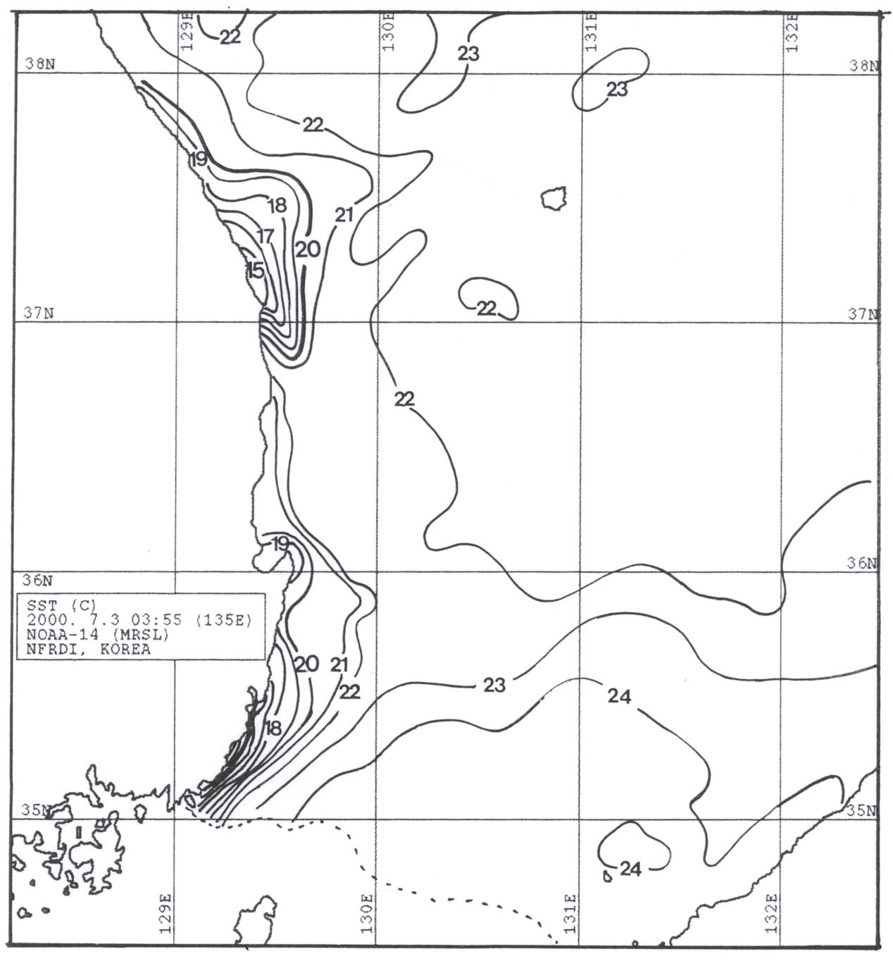 ㅇ 2000년 7월 3일 03시 55분 현재의 한국근해 표면수온분포도입니다.