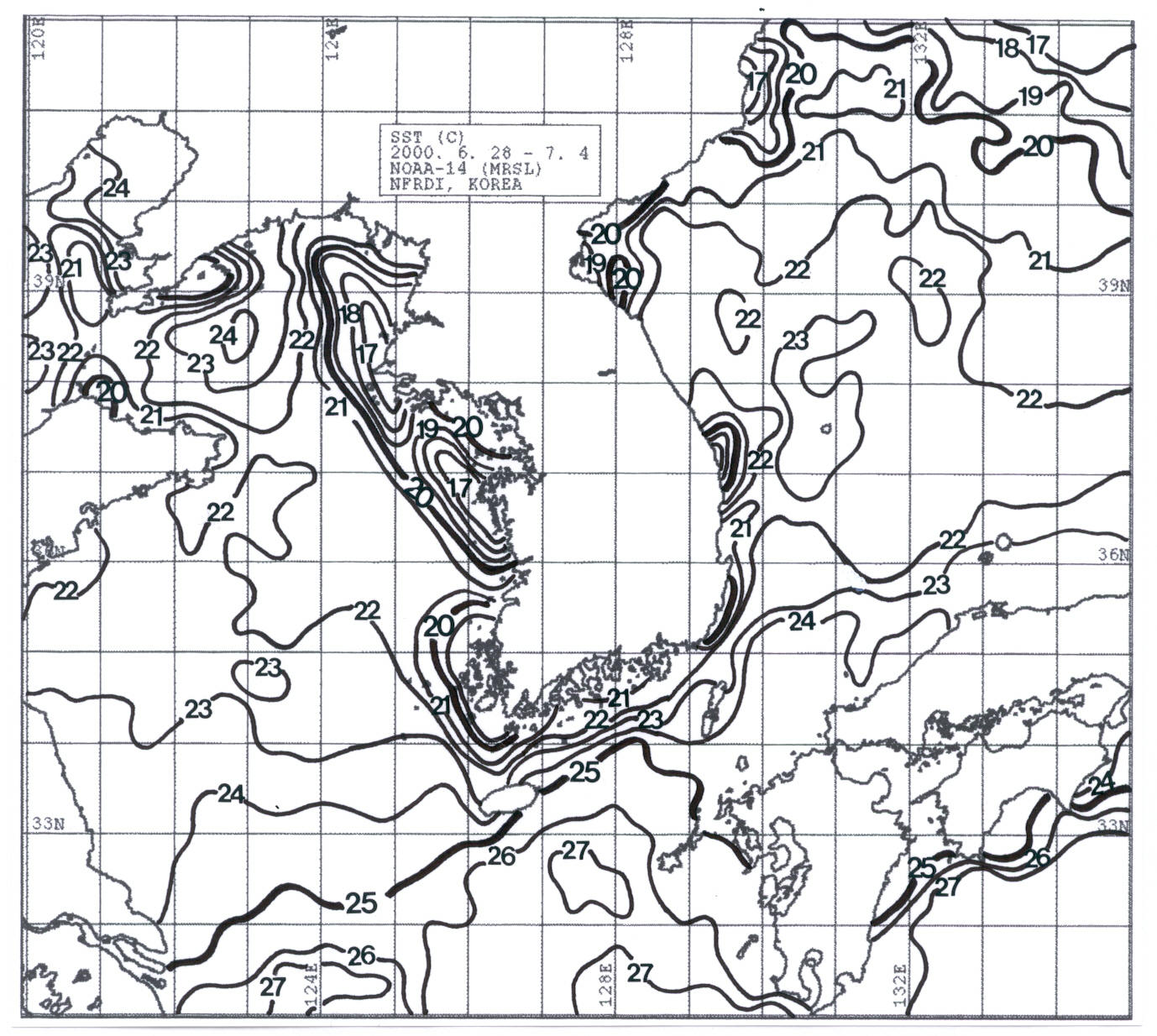 ㅇ 2000년 6월 28일부터 7월 4일까지 합성한 한국근해 표면수온분포도입니다.
