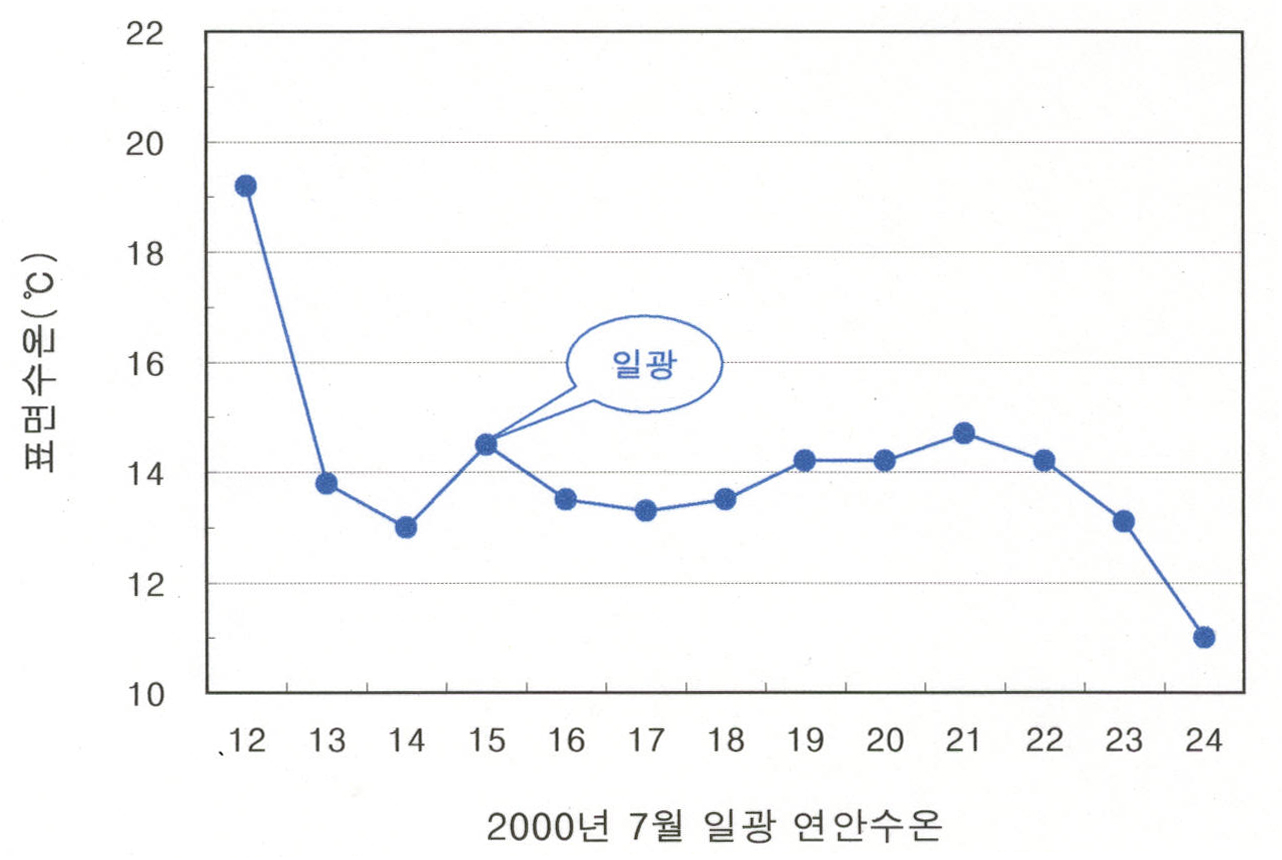 o 2000년 7월 24일 오전 10시 현재 동해남부 연안수온이 기장연안에서 10.5도,