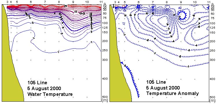 105선(동해 동방)의 수직수온분포도 및 평년편차도 입니다.