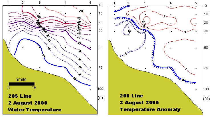 205선(여수남방)의 수직수온분포도 및 평년편차도 입니다.