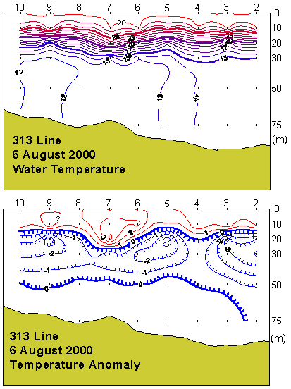313선(제주 서부해역)의 수직수온분포도 및 평년편차도 입니다.