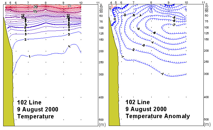 102선(포항 동방)의 수직수온분포도 및 평년편차도 입니다.
