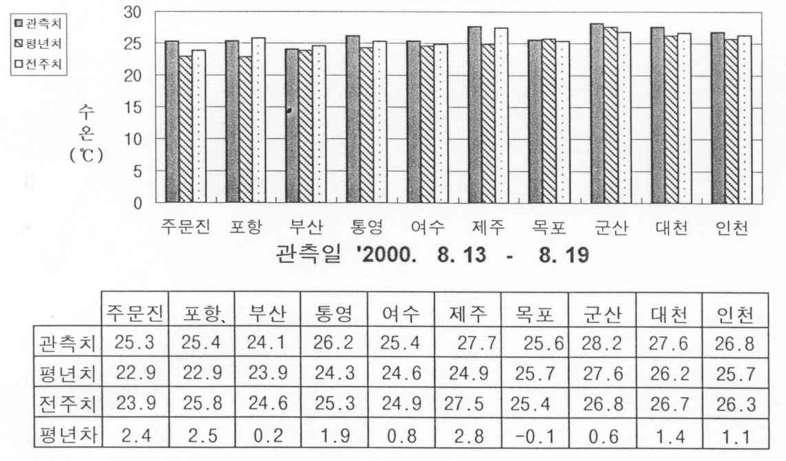 o 금주(2000. 8. 27 - 9. 2)의 한반도 연안역 표면수온은 주문진 26도,