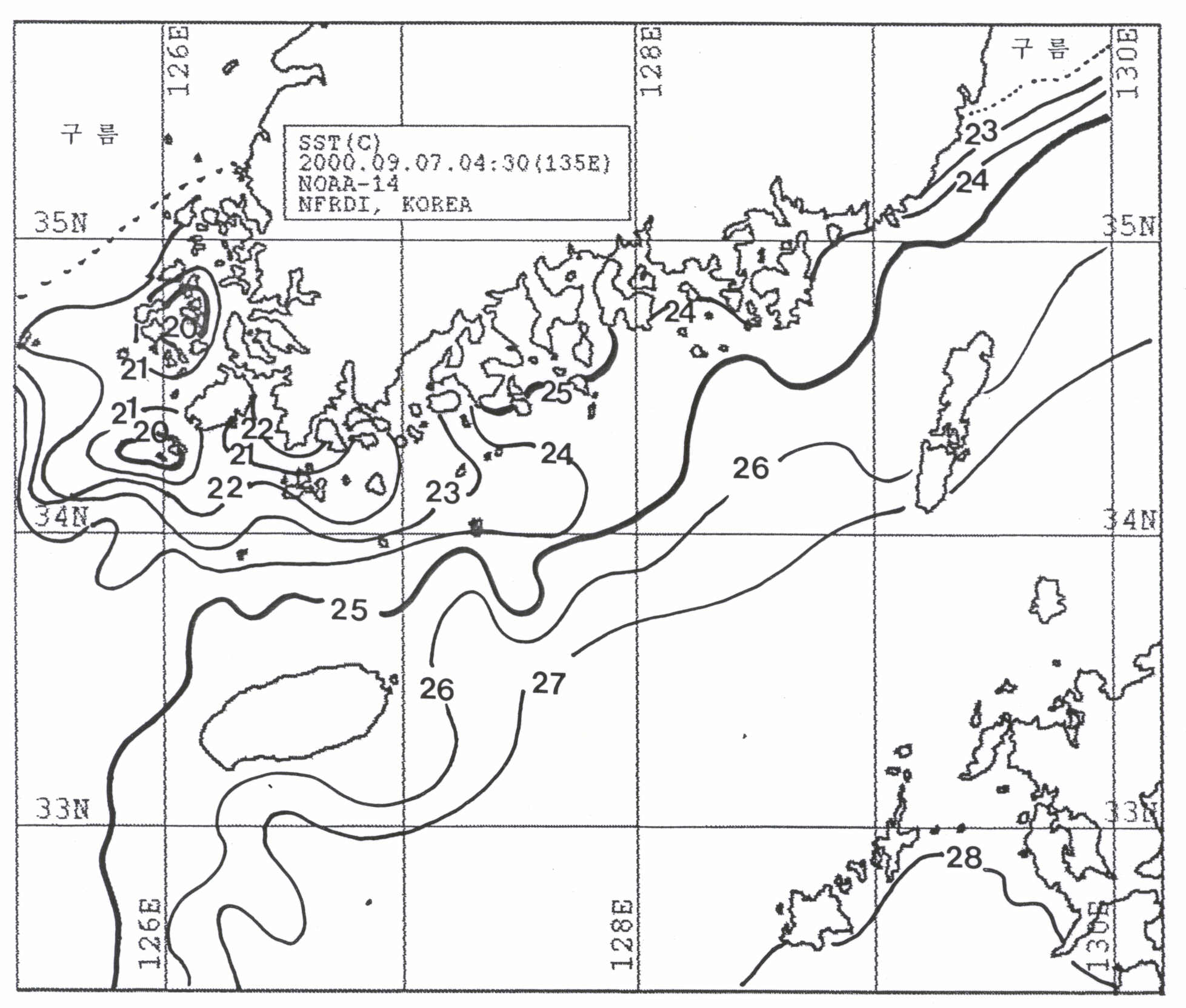 o 아래는 2000년 9월 7일 04시 30분 현재 NOAA위성이 관측한 표면 수온분포도