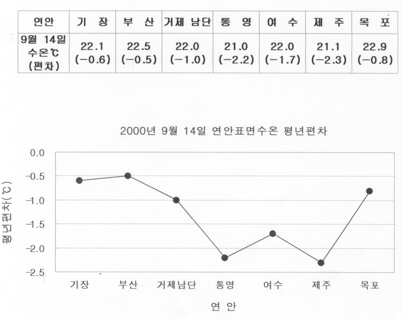 o 아래는 2000년 9월 14일 오전 10시 현재 적조발생 주변해역의 연안관측수온과