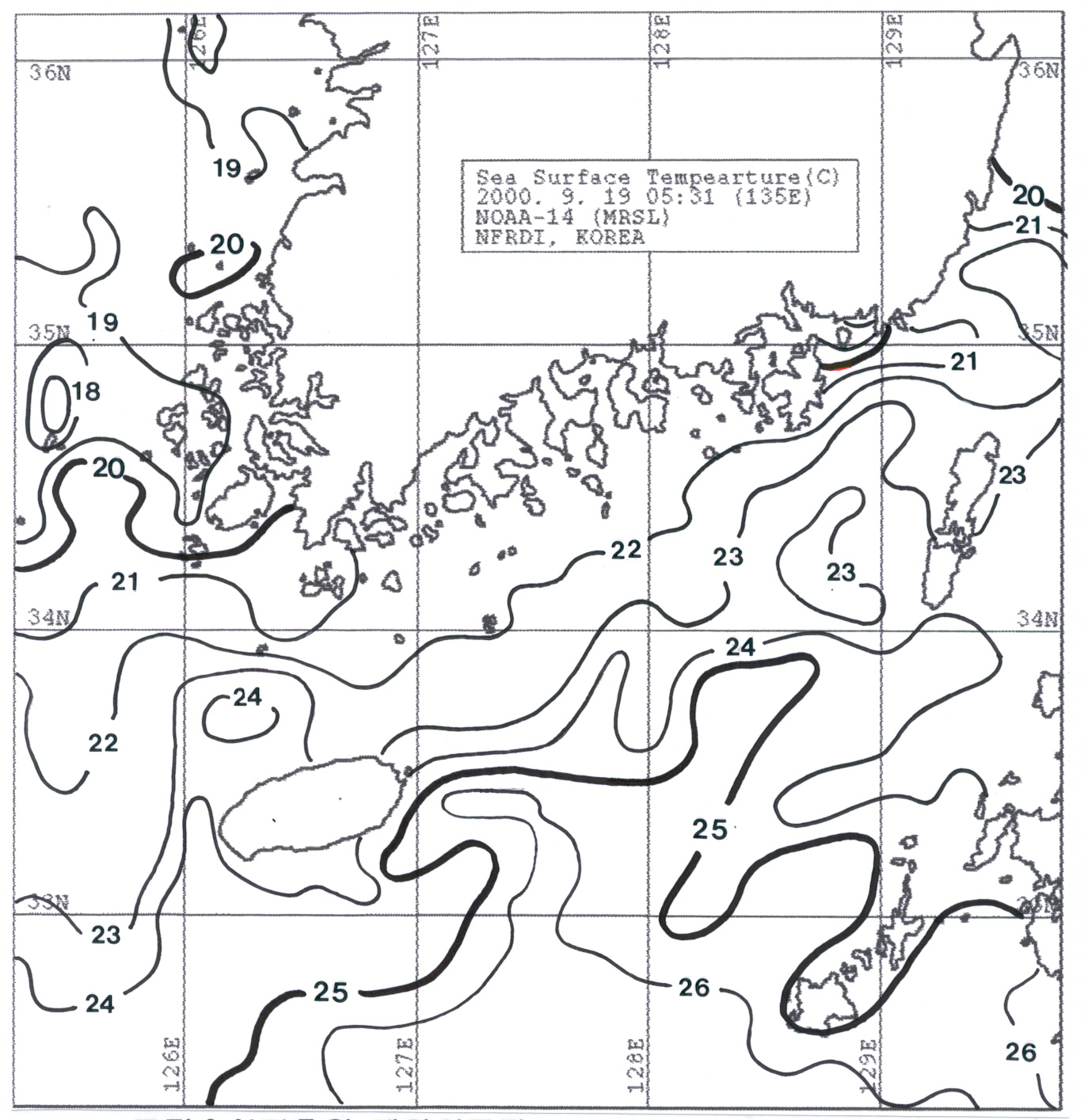 o 아래는 2000년 9월 19일 05시 31분 현재 NOAA위성이 관측한 표면 수온분포도