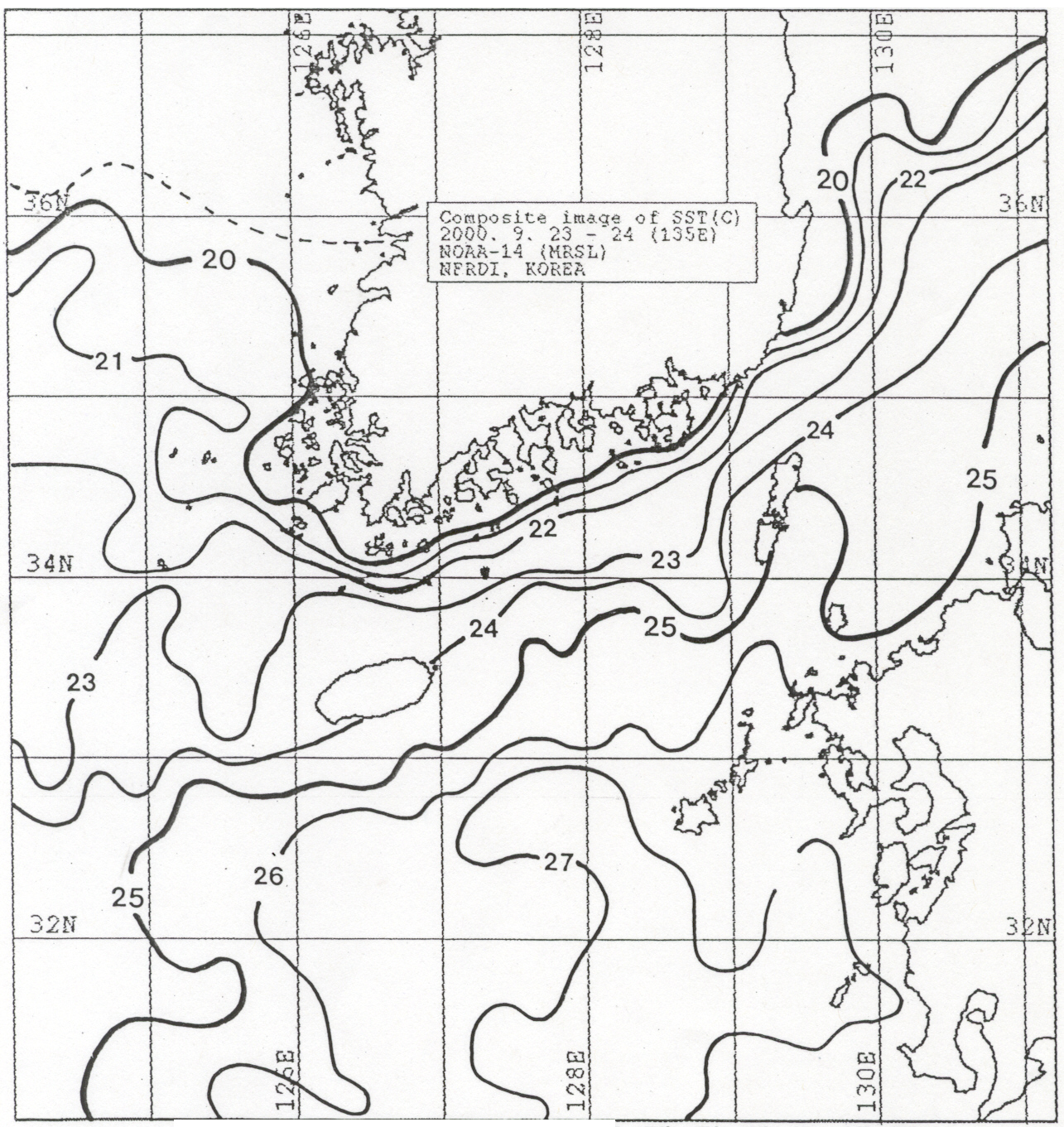 o 대마도 및 제주도 근해 24도, 파랑초 근해 25도, 일향초 근해 22도로