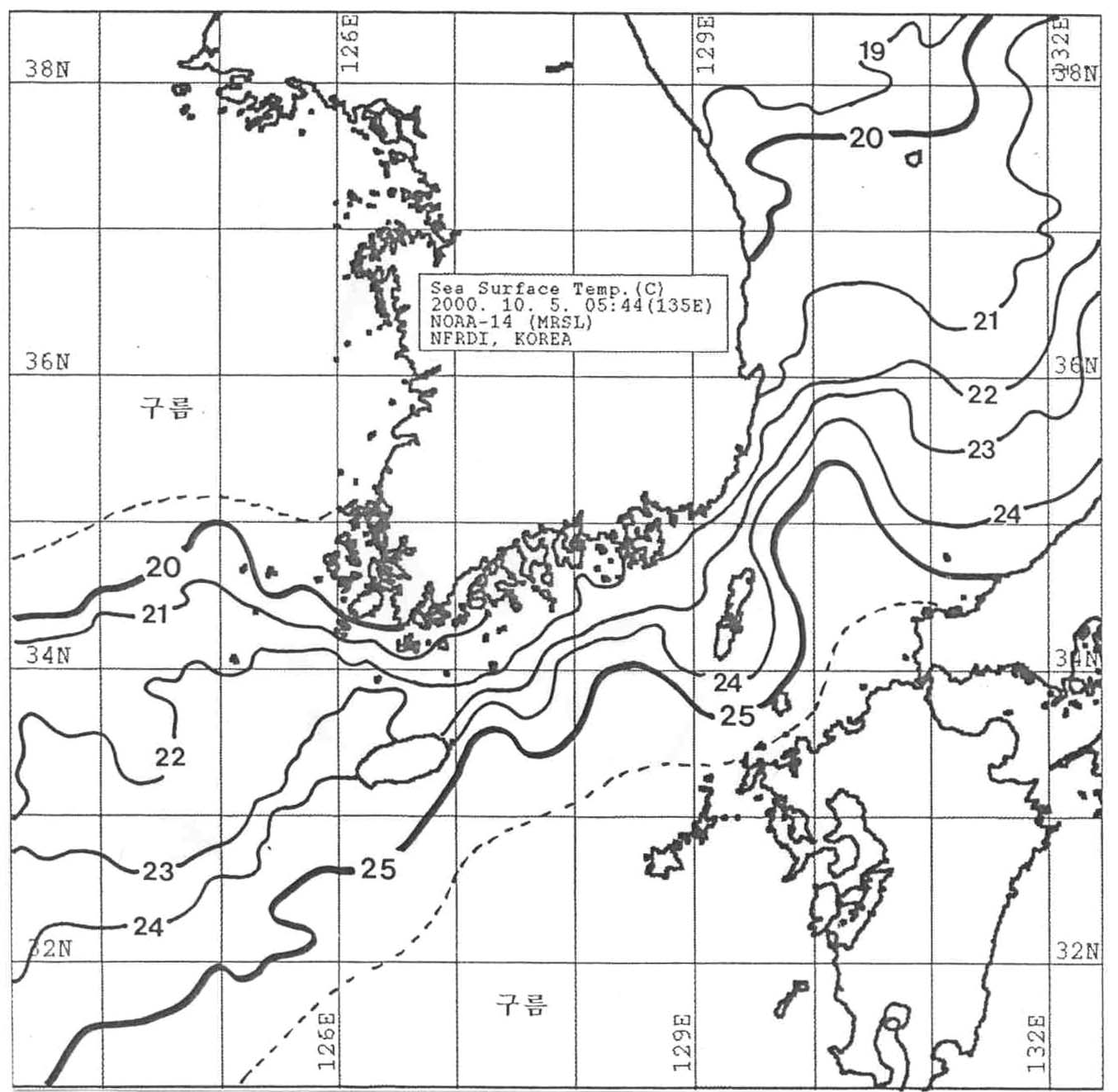 o 2000년 10월 5일 05시 44분 현재 위성이 관측한 표면 수온분포도입니다.