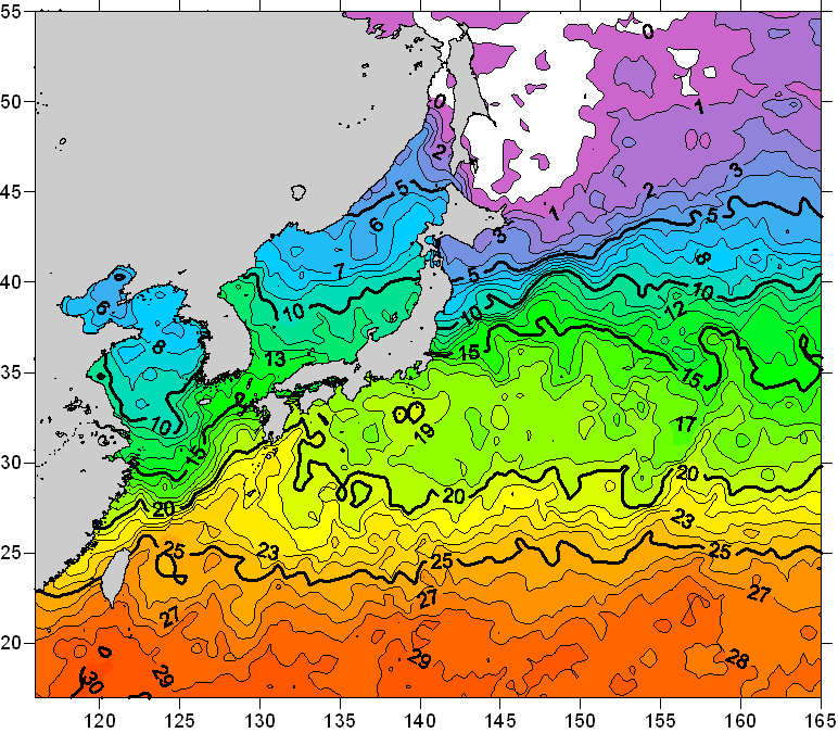 o 2008년 04월 10일 북서태평양 광역해양 수온분포 입니다. o 아래 위성 수온분포도는 국립수산과학원(NFRDI, Korea)과 일본동북대학교(Tohoku University, Japan)가 공동연구개발 진행중, 1차 연구결과인 것으로 구름의 영향을 배제한 신기술의 수온정보입니다.
