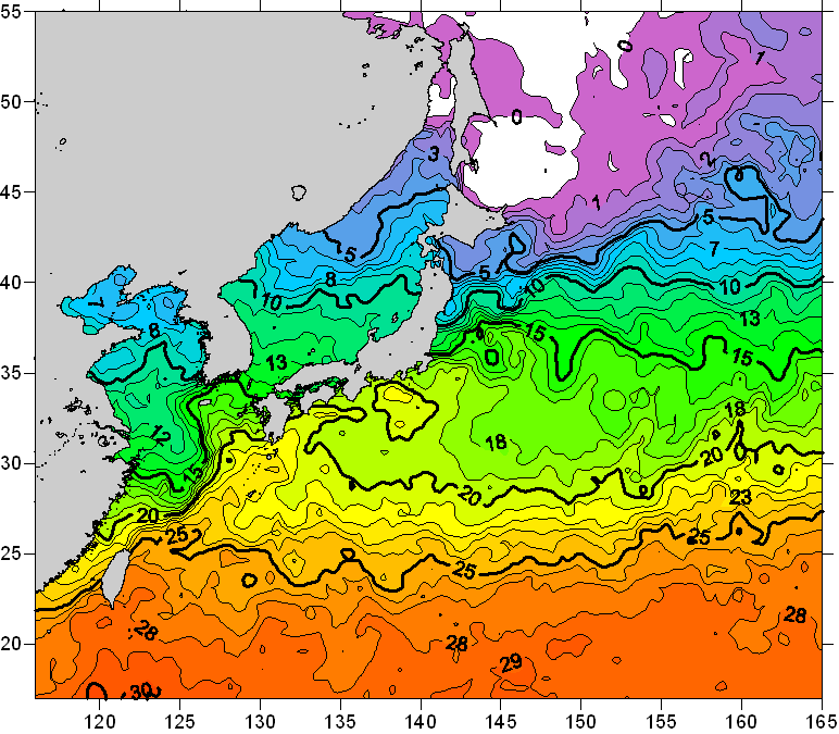 o 2008년 04월 12일 북서태평양 광역해양 수온분포 입니다. o 아래 위성 수온분포도는 국립수산과학원(NFRDI, Korea)과 일본동북대학교(Tohoku University, Japan)가 공동연구개발 진행중, 1차 연구결과인 것으로 구름의 영향을 배제한 신기술의 수온정보입니다.