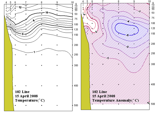 ㅇ 2008년 4월 15일 국립수산과학원 동해수산연구소에서 조사한 102선(포항 동방)의 수직수온분포도 및 평년편차도 입니다. ㅇ 수온약층은 75~125m층 부근에서 8℃를 중심으로 형성되었으며, 외해역에 비하여 연안역 주변의 수온이 높은 경향을 보였습니다. ㅇ 평년에 비하여 연안 표층 및 중층을 중심으로 1~2℃ 고온상을 보인 반면, 그 외 대부분의 해역에서는 1~5℃ 저온상을 나타내었습니다.