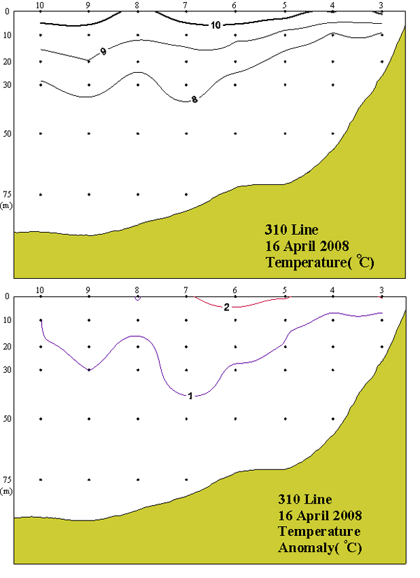 ㅇ 2008년 4월 16일 국립수산과학원 서해수산연구소에서 조사한 310선 (영광 서방)의 수직수온분포도 및 평년편차도입니다. ㅇ 표층 주변에 약한 성층이 형성되었으며, 연안과 외해역의 공간적인 수온 구조의 차는 나타나지 않았습니다. ㅇ 평년에 비하여 표층에서는 1~2℃, 중층 및 저층에서는 1℃ 내외의 고수온상을 나타내었습니다.