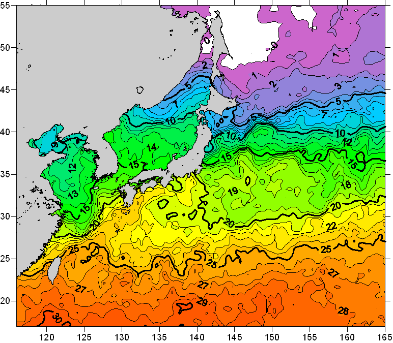 o 2008년 04월 22일 북서태평양 광역해양 수온분포 입니다. o 아래 위성 수온분포도는 국립수산과학원(NFRDI, Korea)과 일본동북대학교(Tohoku University, Japan)가 공동연구개발 진행중, 1차 연구결과인 것으로 구름의 영향을 배제한 신기술의 수온정보입니다.