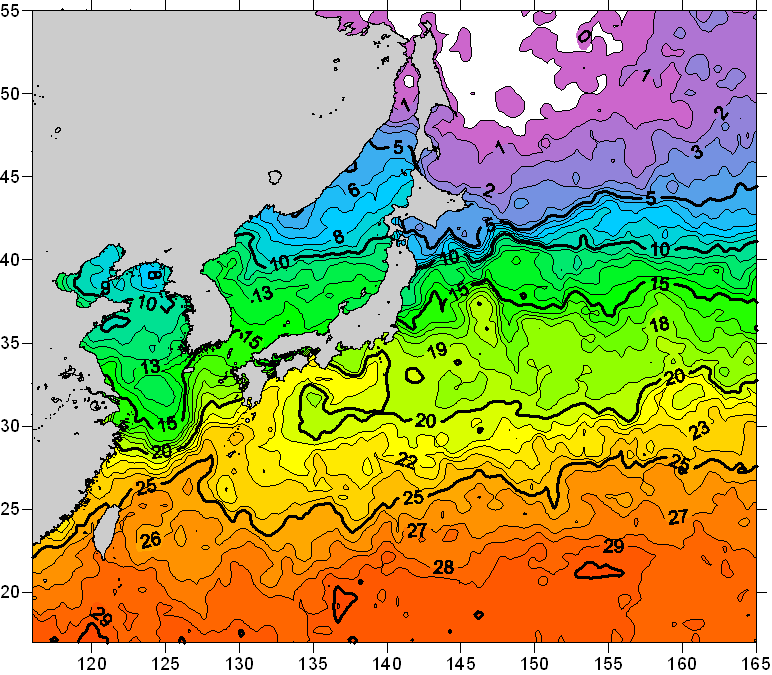 o 2008년 04월 28일 북서태평양 광역해양 수온분포 입니다. o 아래 위성 수온분포도는 국립수산과학원(NFRDI, Korea)과 일본동북대학교(Tohoku University, Japan)가 공동연구개발 진행중, 1차 연구결과인 것으로 구름의 영향을 배제한 신기술의 수온정보입니다.
