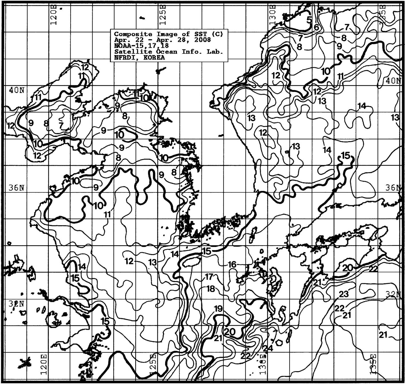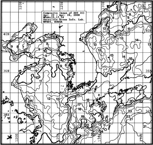 o 금주(2008.04.22~2008.04.28)의 한국근해 표면수온은 대화퇴 근해 13~14도, 울릉도 근해 12~14도, 대마도 근해 15~16도, 제주도 근해 15~17도, 이어도 근해 11~13도, 가거초 근해 10~12도, 어청도 근해 9~11도 내외로 나타납니다.