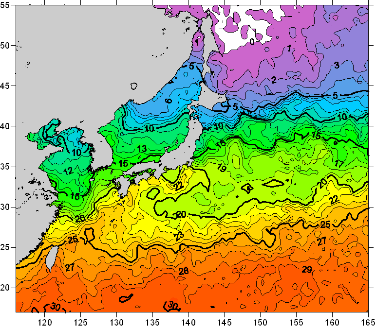 o 2008년 04월 30일 북서태평양 광역해양 수온분포 입니다. o 아래 위성 수온분포도는 국립수산과학원(NFRDI, Korea)과 일본동북대학교(Tohoku University, Japan)가 공동연구개발 진행중, 1차 연구결과인 것으로 구름의 영향을 배제한 신기술의 수온정보입니다.