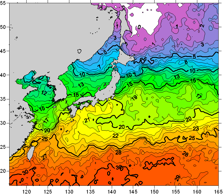 o 2008년 05월 01일 북서태평양 광역해양 수온분포 입니다. o 아래 위성 수온분포도는 국립수산과학원(NFRDI, Korea)과 일본동북대학교(Tohoku University, Japan)가 공동연구개발 진행중, 1차 연구결과인 것으로 구름의 영향을 배제한 신기술의 수온정보입니다.