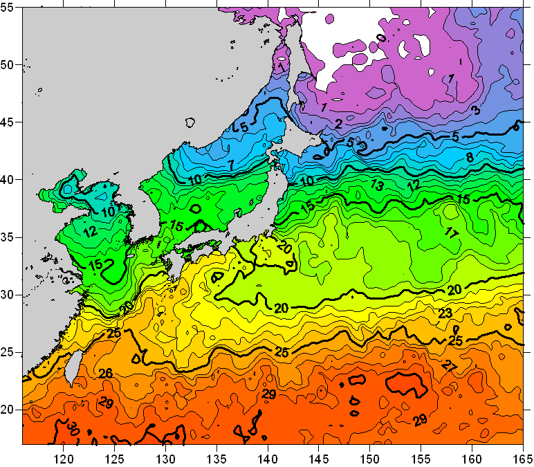 o 2008년 05월 02일 북서태평양 광역해양 수온분포 입니다. o 아래 위성 수온분포도는 국립수산과학원(NFRDI, Korea)과 일본동북대학교(Tohoku University, Japan)가 공동연구개발 진행중, 1차 연구결과인 것으로 구름의 영향을 배제한 신기술의 수온정보입니다.