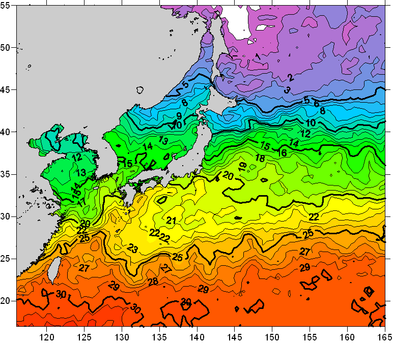 o 2008년 05월 08일 북서태평양 광역해양 수온분포 입니다. o 아래 위성 수온분포도는 국립수산과학원(NFRDI, Korea)과 일본동북대학교(Tohoku University, Japan)가 공동연구개발 진행중, 1차 연구결과인 것으로 구름의 영향을 배제한 신기술의 수온정보입니다.