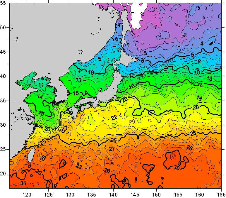 o 2008년 05월 10일 북서태평양 광역해양 수온분포 입니다. o 아래 위성 수온분포도는 국립수산과학원(NFRDI, Korea)과 일본동북대학교(Tohoku University, Japan)가 공동연구개발 진행중, 1차 연구결과인 것으로 구름의 영향을 배제한 신기술의 수온정보입니다.
