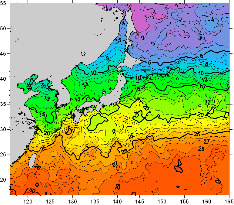 o 2008년 05월 12일 북서태평양 광역해양 수온분포 입니다. o 아래 위성 수온분포도는 국립수산과학원(NFRDI, Korea)과 일본동북대학교(Tohoku University, Japan)가 공동연구개발 진행중, 1차 연구결과인 것으로 구름의 영향을 배제한 신기술의 수온정보입니다.
