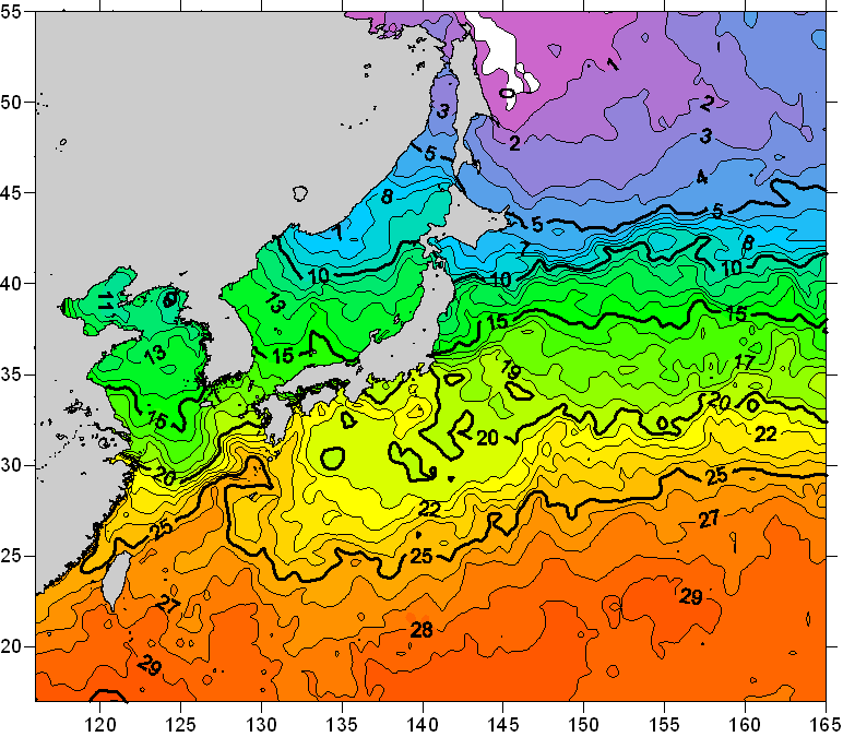 o 2008년 05월 13일 북서태평양 광역해양 수온분포 입니다. o 아래 위성 수온분포도는 국립수산과학원(NFRDI, Korea)과 일본동북대학교(Tohoku University, Japan)가 공동연구개발 진행중, 1차 연구결과인 것으로 구름의 영향을 배제한 신기술의 수온정보입니다.