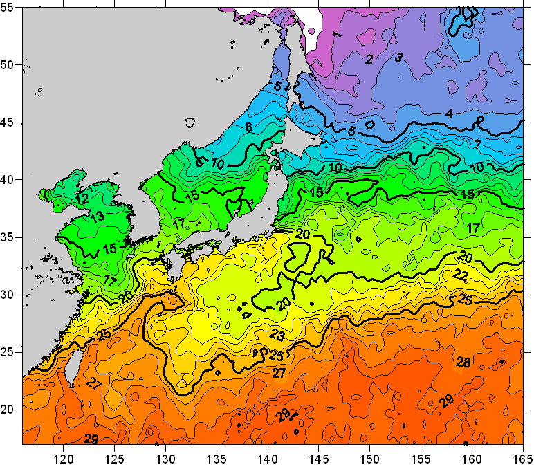 o 2008년 05월 17일 북서태평양 광역해양 수온분포 입니다. o 아래 위성 수온분포도는 국립수산과학원(NFRDI, Korea)과 일본동북대학교(Tohoku University, Japan)가 공동연구개발 진행중, 1차 연구결과인 것으로 구름의 영향을 배제한 신기술의 수온정보입니다.