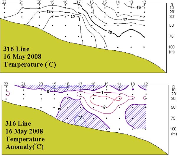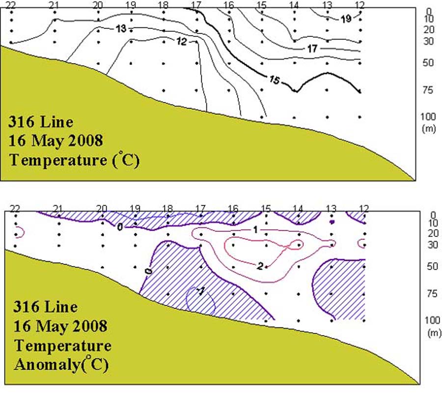 ㅇ 2008년 5월 16일 국립수산과학원 해양연구팀에서 조사한 동중국해 북부해역(316선)의 수온 수직분포도와 평년편차도입니다.