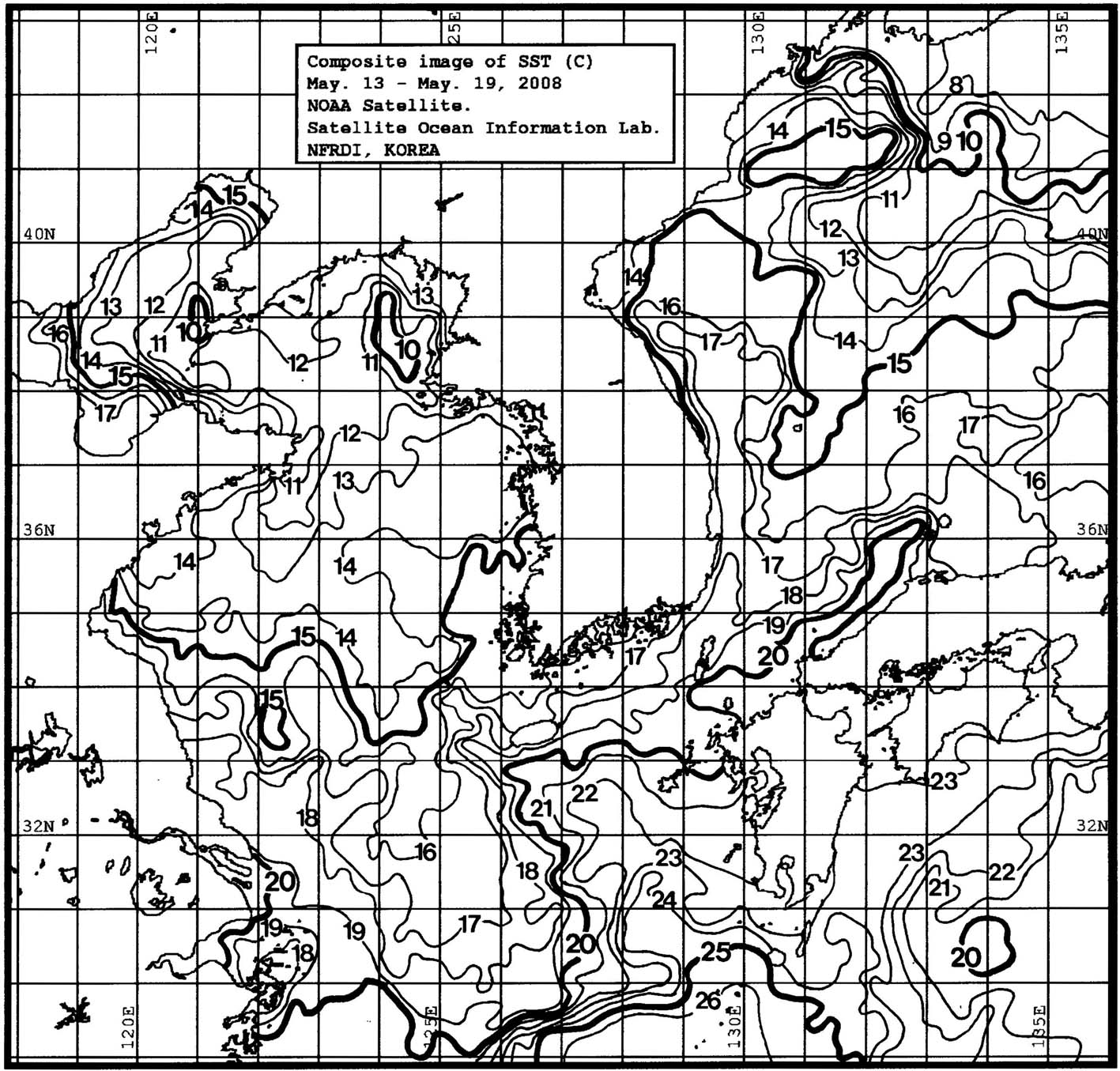 o 금주(2008.05.13~2008.05.19)의 한국근해 표면수온은 대화퇴 근해 13~15도, 울릉도 근해 14~16도, 대마도 근해 18~20도, 제주도 근해 17~20도, 이어도 근해 16~17도, 가거초 근해 14~16도, 어청도 근해 13~15도 내외로 나타납니다.