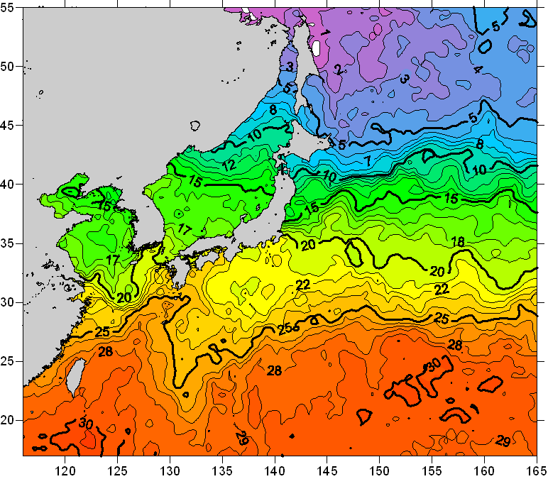 o 2008년 05월 25일 북서태평양 광역해양 수온분포 입니다. o 아래 위성 수온분포도는 국립수산과학원(NFRDI, Korea)과 일본동북대학교(Tohoku University, Japan)가 공동연구개발 진행중, 1차 연구결과인 것으로 구름의 영향을 배제한 신기술의 수온정보입니다.
