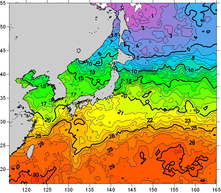 o 2008년 05월 26일 북서태평양 광역해양 수온분포 입니다. o 아래 위성 수온분포도는 국립수산과학원(NFRDI, Korea)과 일본동북대학교(Tohoku University, Japan)가 공동연구개발 진행중, 1차 연구결과인 것으로 구름의 영향을 배제한 신기술의 수온정보입니다.