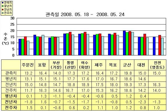 o 금주(2008.05.18~2008.05.24)의 한반도 연안 표면수온은 동해 연안역에서 섭씨 13~17도, 남해 연안역 16~18도, 서해 연안역에서 15~20도 내외로 나타납니다.