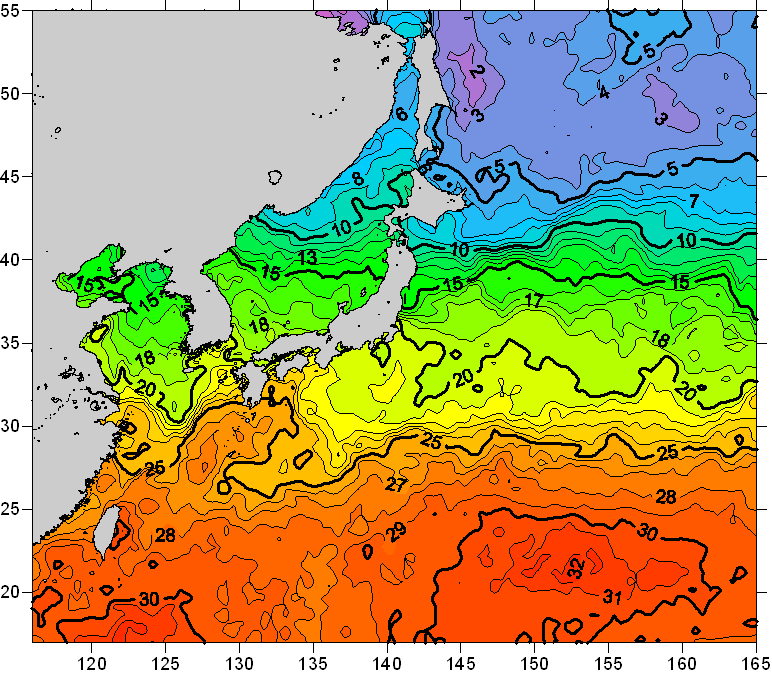 o 2008년 05월 31일 북서태평양 광역해양 수온분포 입니다. o 아래 위성 수온분포도는 국립수산과학원(NFRDI, Korea)과 일본동북대학교(Tohoku University, Japan)가 공동연구개발 진행중, 1차 연구결과인 것으로 구름의 영향을 배제한 신기술의 수온정보입니다.