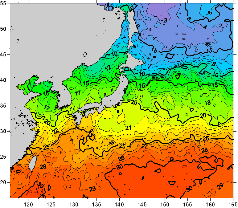 o 2008년 06월 04일 북서태평양 광역해양 수온분포 입니다. o 아래 위성 수온분포도는 국립수산과학원(NFRDI, Korea)과 일본동북대학교(Tohoku University, Japan)가 공동연구개발 진행중, 1차 연구결과인 것으로 구름의 영향을 배제한 신기술의 수온정보입니다.