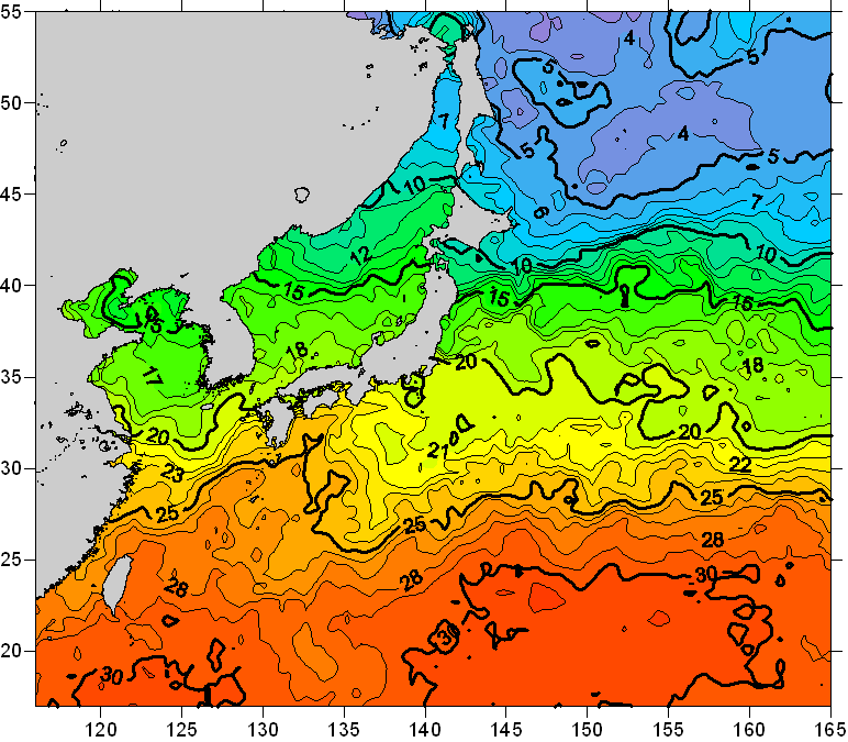 o 2008년 06월 05일 북서태평양 광역해양 수온분포 입니다. o 아래 위성 수온분포도는 국립수산과학원(NFRDI, Korea)과 일본동북대학교(Tohoku University, Japan)가 공동연구개발 진행중, 1차 연구결과인 것으로 구름의 영향을 배제한 신기술의 수온정보입니다.