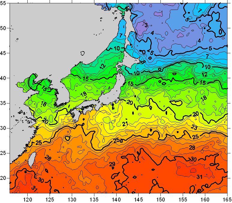 o 2008년 06월 06일 북서태평양 광역해양 수온분포 입니다. o 아래 위성 수온분포도는 국립수산과학원(NFRDI, Korea)과 일본동북대학교(Tohoku University, Japan)가 공동연구개발 진행중, 1차 연구결과인 것으로 구름의 영향을 배제한 신기술의 수온정보입니다.