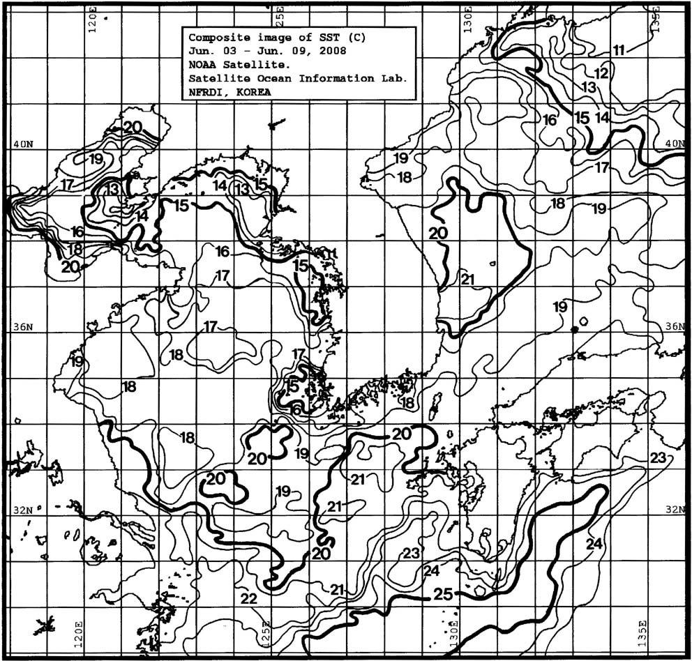 o 금주(2008.06.03~2008.06.09)의 한국근해 표면수온은 대화퇴 근해 14~17도, 울릉도 근해 19~21도, 대마도 근해 19~21도, 제주도 근해 18~21도, 이어도 근해 19~20도, 가거초 근해 18~20도, 어청도 근해 15~18도 내외로 나타납니다.