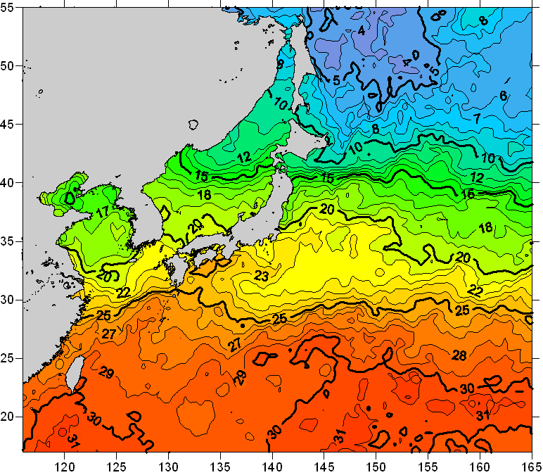 o 2008년 06월 10일 북서태평양 광역해양 수온분포 입니다. o 아래 위성 수온분포도는 국립수산과학원(NFRDI, Korea)과 일본동북대학교(Tohoku University, Japan)가 공동연구개발 진행중, 1차 연구결과인 것으로 구름의 영향을 배제한 신기술의 수온정보입니다.