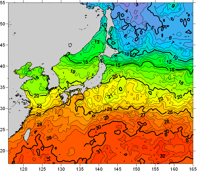 o 2008년 06월 11일 북서태평양 광역해양 수온분포 입니다. o 아래 위성 수온분포도는 국립수산과학원(NFRDI, Korea)과 일본동북대학교(Tohoku University, Japan)가 공동연구개발 진행중, 1차 연구결과인 것으로 구름의 영향을 배제한 신기술의 수온정보입니다.