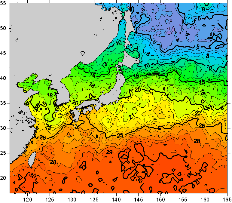 o 2008년 06월 14일 북서태평양 광역해양 수온분포 입니다. o 아래 위성 수온분포도는 국립수산과학원(NFRDI, Korea)과 일본동북대학교(Tohoku University, Japan)가 공동연구개발 진행중, 1차 연구결과인 것으로 구름의 영향을 배제한 신기술의 수온정보입니다.