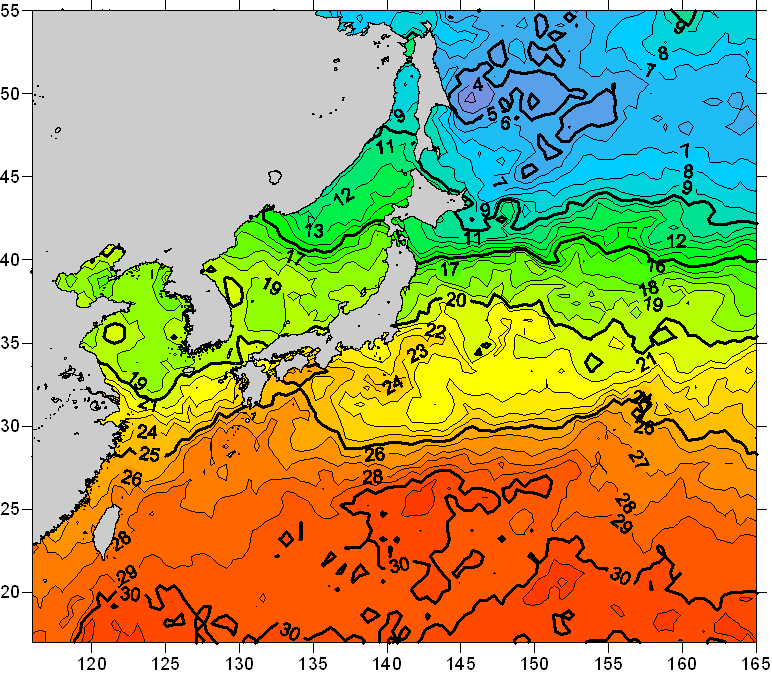 o 2008년 06월 17일 북서태평양 광역해양 수온분포 입니다. o 아래 위성 수온분포도는 국립수산과학원(NFRDI, Korea)과 일본동북대학교(Tohoku University, Japan)가 공동연구개발 진행중, 1차 연구결과인 것으로 구름의 영향을 배제한 신기술의 수온정보입니다.